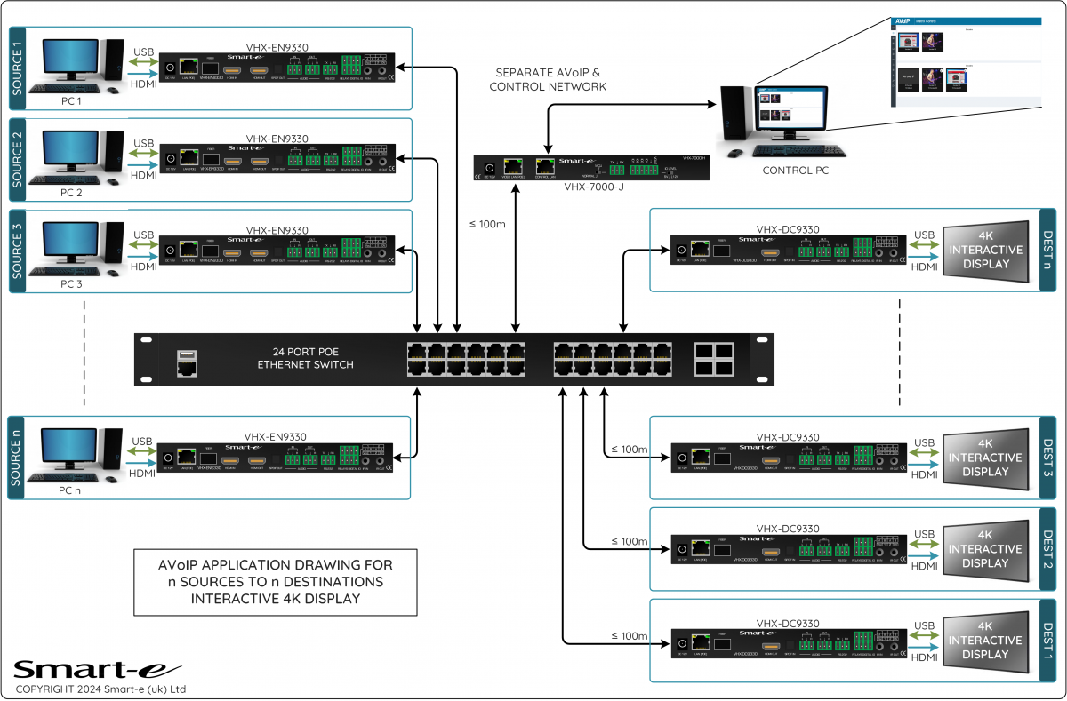 Video streaming is compatible with a standard 1G Ethernet IGMP switcher using the Unicast and Multicast protocols. Point to point, point to multipoint and matrix switching can be achieved easily using industry standard Ethernet switchers and installation enhanced with the POE feature. A USB host connection allows a connected computer to extend both USB V1.1 and V2.0 signal to a VHX-DC9330 decoder which can provide the facility for up to 5 peripherals to be added. Other control signals can also be transmitted over the same network which can be used for RS232, infrared and CEC signals.