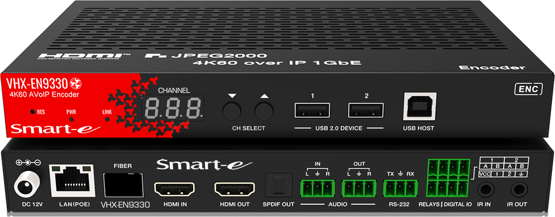 The VHX-EN9330 4K 60Hz AVoIP Encoder is a flexible and cost-effective Audio and Video over Internet Protocol (AVoIP) encoder for HDMI, audio, infrared, R232 and USB 1.1 / 2.0 signals. The units enable high definition HDMI signals up to 4K resolutions to be transmitted over 1G Ethernet network with minimal latency and excellent visual quality.